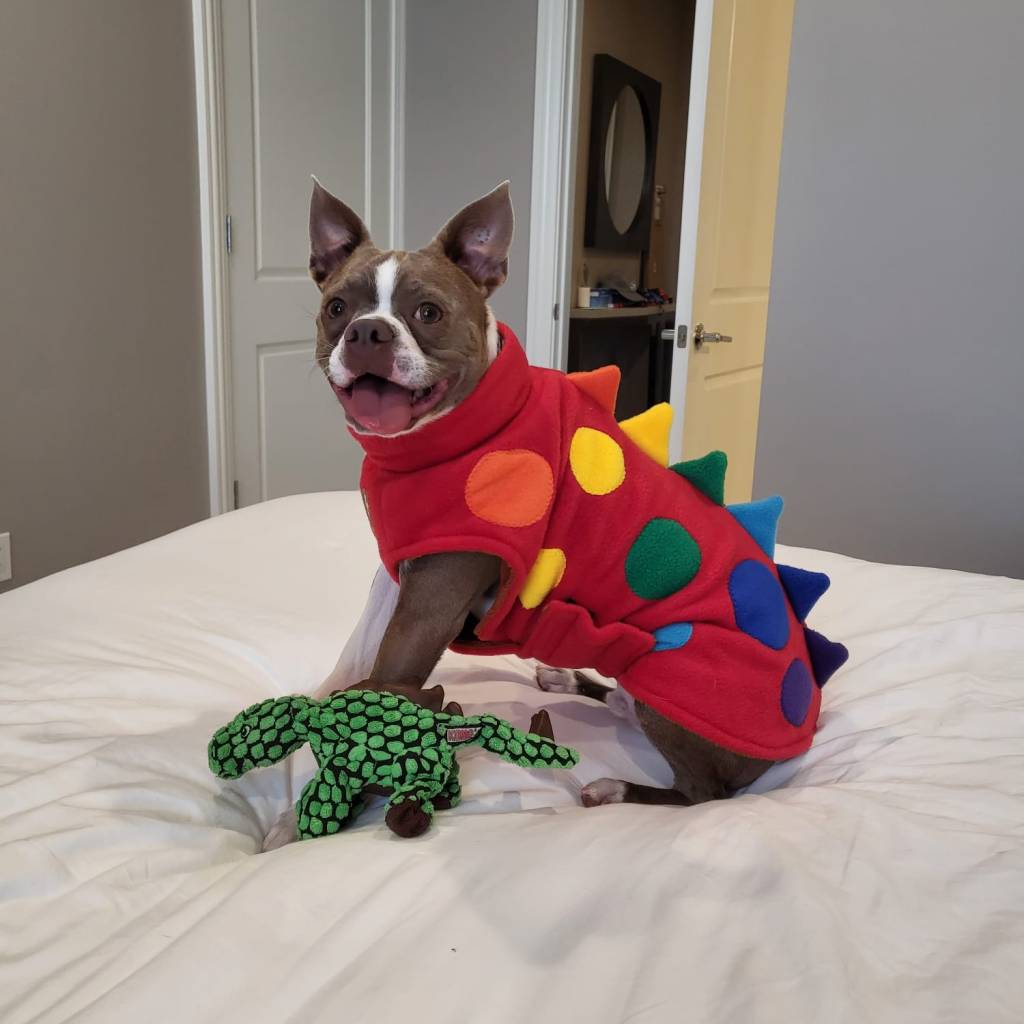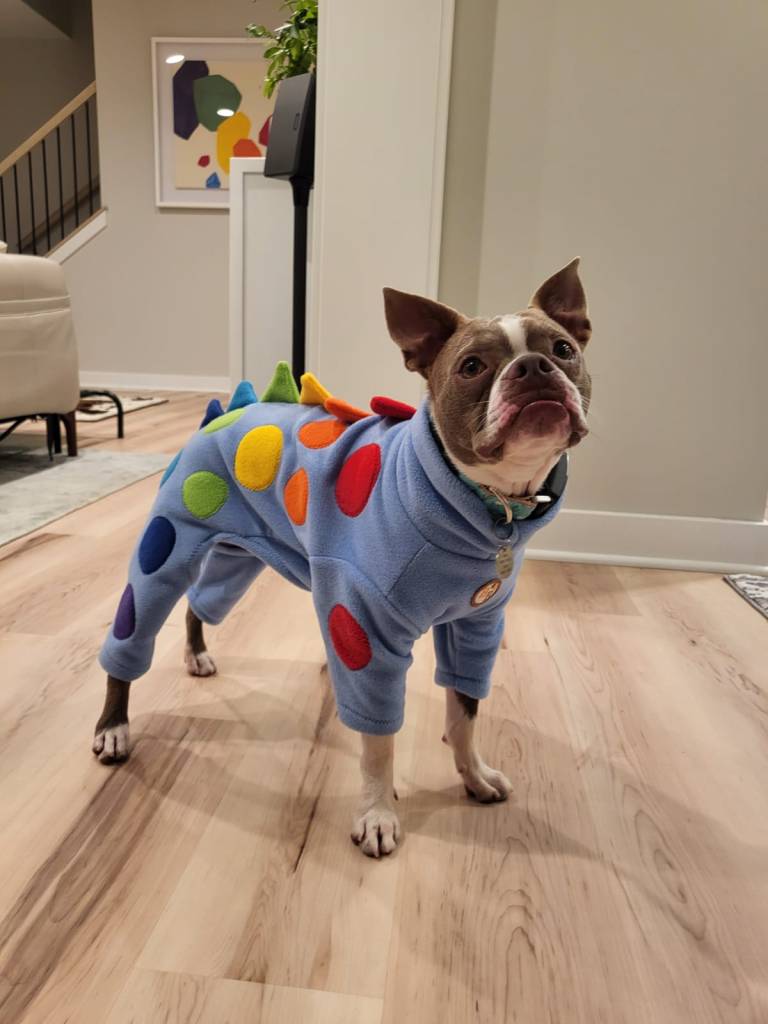 We typically shower Nomii once a week and continue to do so even in the winter because he plays outdoors, with other dogs (i.e. often covered in drool) and sleeps in bed with us. In winter, it is even more important to keep him warm after showering with warm water and we have this custom red dino onesie with a towel material on the inside that dries him up in no time. He has a non-toweling onesie with legs too and that’s more for looking cute when out and about.