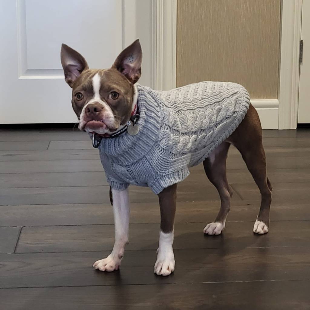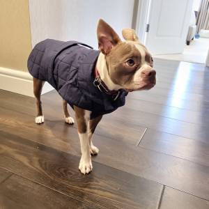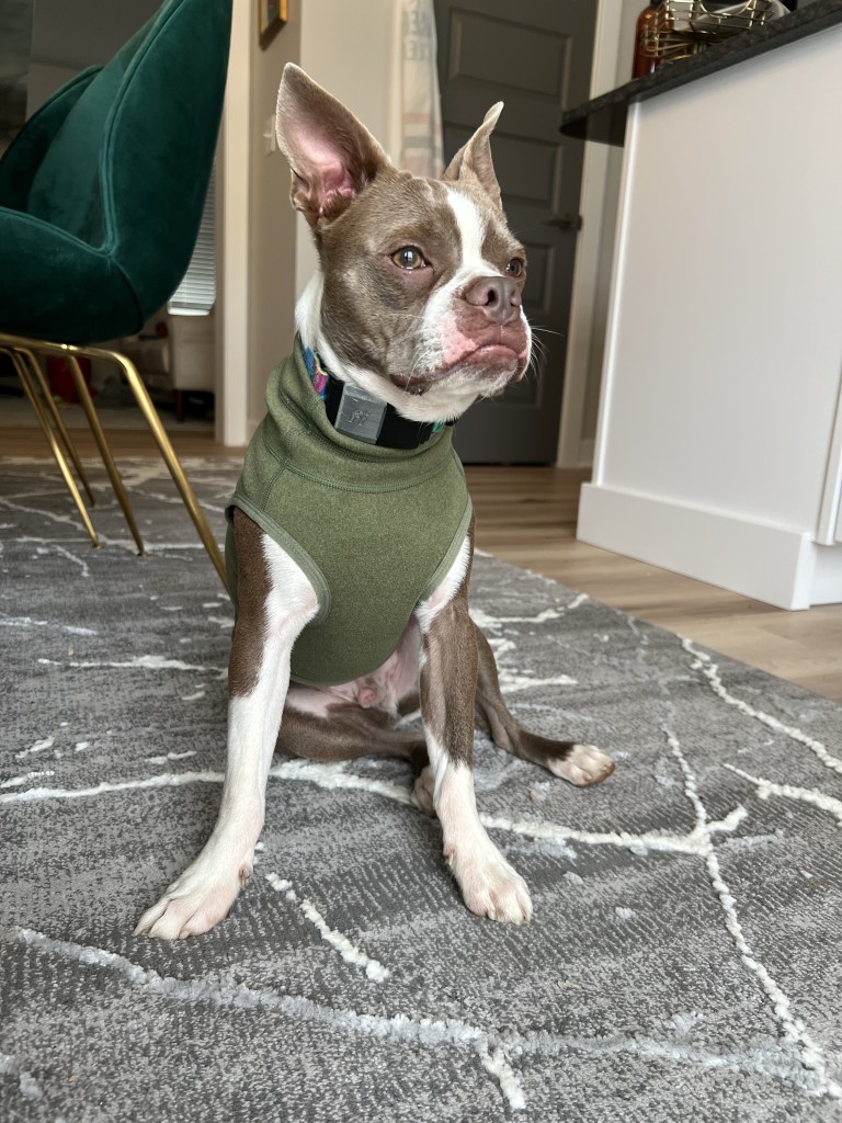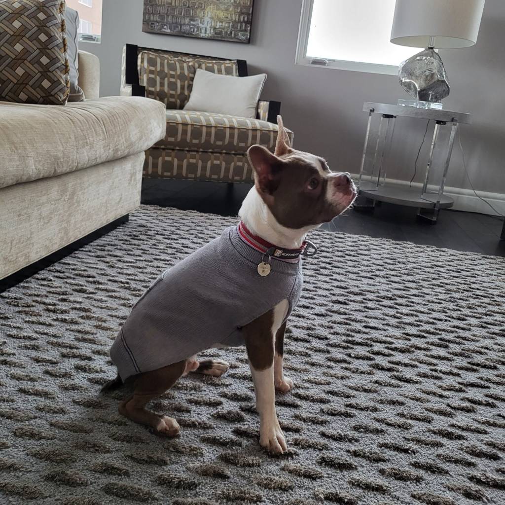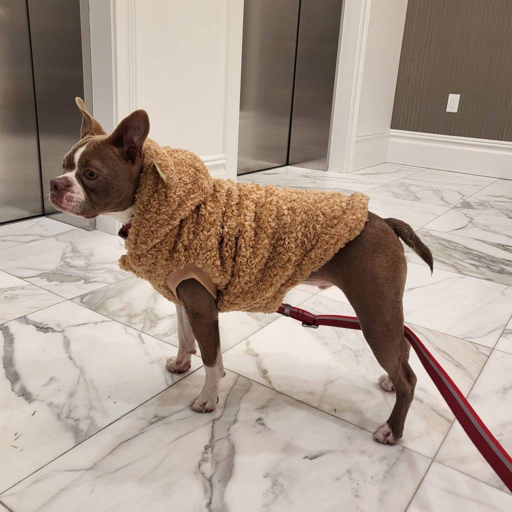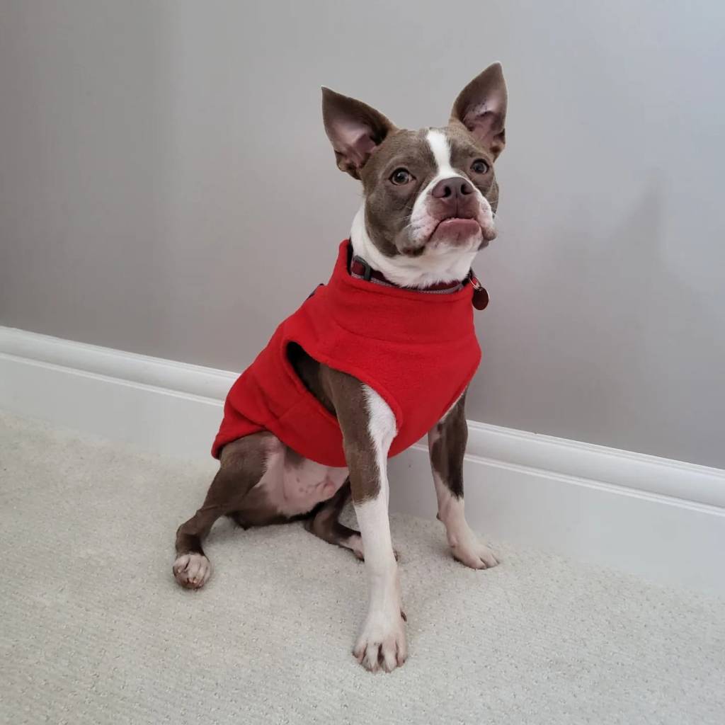 These sleeveless fleece are great for indoors when it’s cold outside. Nomii wears these to daycare where they play indoors if the weather’s nasty but gets some outside time if the sun is out. Between 5C/41F and 12C/55F, he wears his fleece tees on walks too. We get his from Gooby Pets.